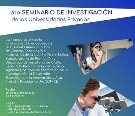 El CRUP realizará la sexta edición del Seminario de Investigación de las Universidades Privadas. Se realizará el 25 de octubre de 8 a 19.30 hs., bajo modalidad híbrida (presencial y virtual). En este evento se expondrá el potencial de investigación de las Universidades Privadas en la Argentina.